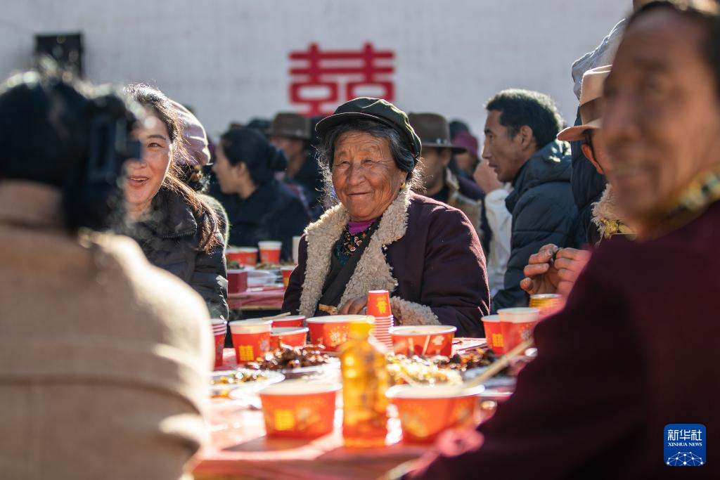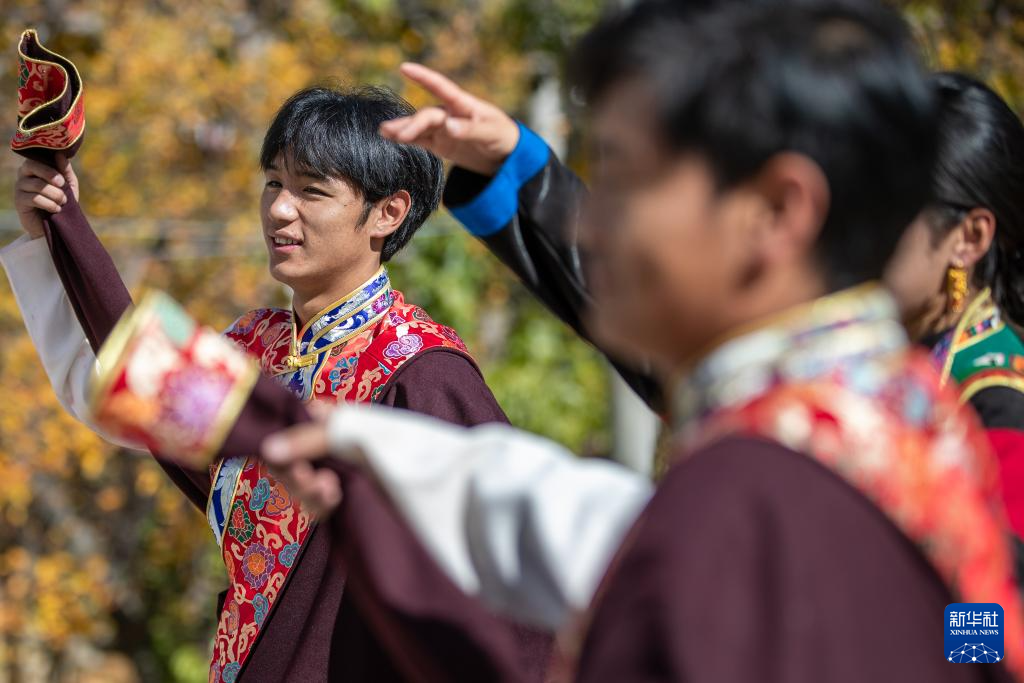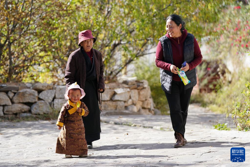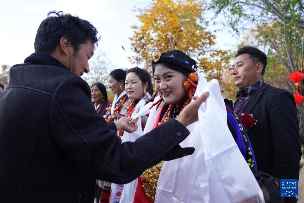 11月2日,在仲德村的一場婚禮上,新娘羅絨扎姆(右二)接受客人的哈達祝福。新華社記者 胥冰潔 攝
