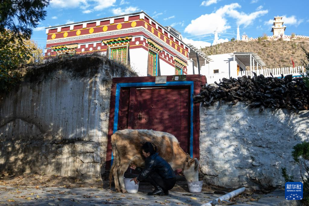 11月2日,仲德村村民四朗擁初在家門口擠牛奶。新華社記者 儲加音 攝