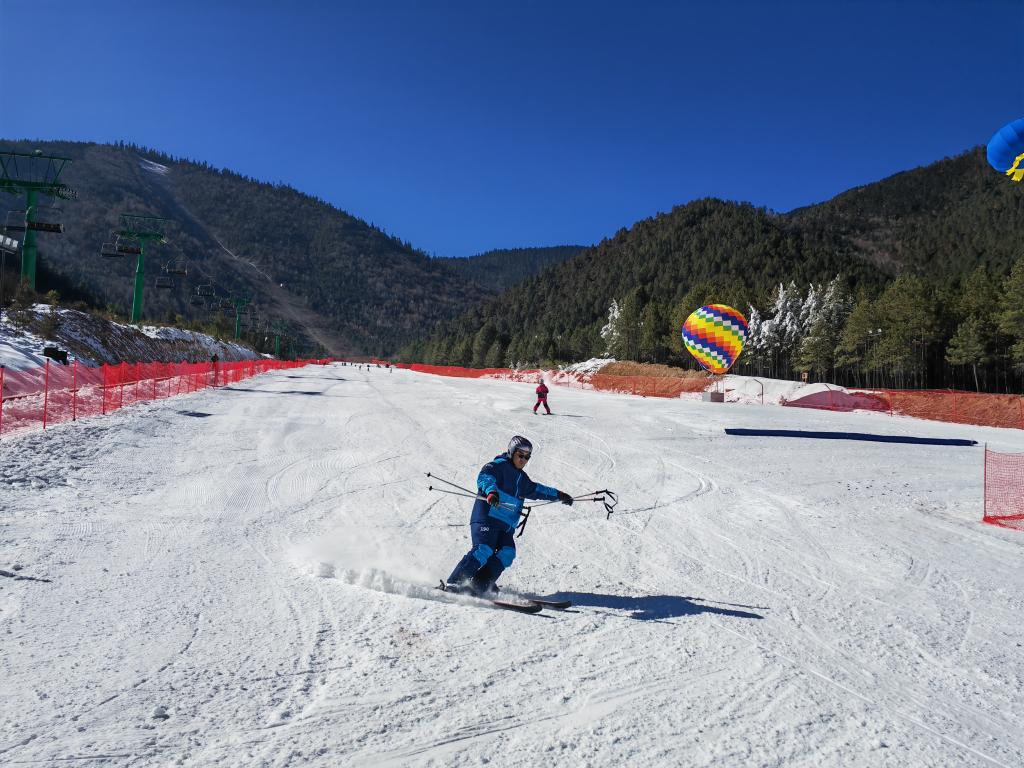 2024年12月28日,游客在云南省迪慶州香格里拉市的七星雪滑雪場滑雪。新華社記者浦超 攝
