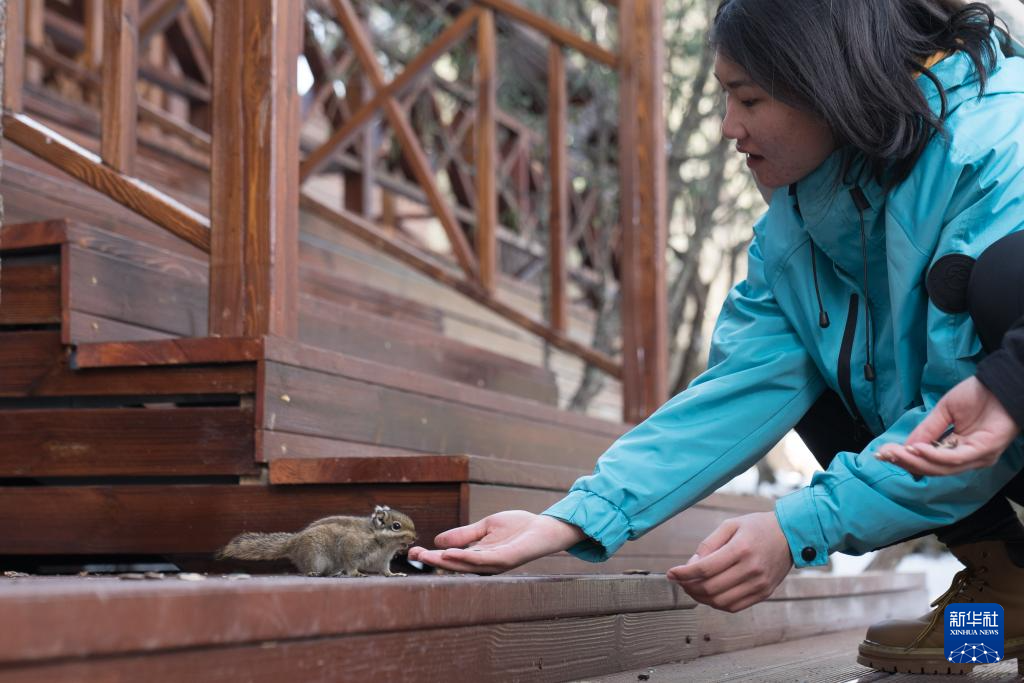 2月23日,游客在普達(dá)措景區(qū)投喂松鼠。新華社 彭奕凱 攝