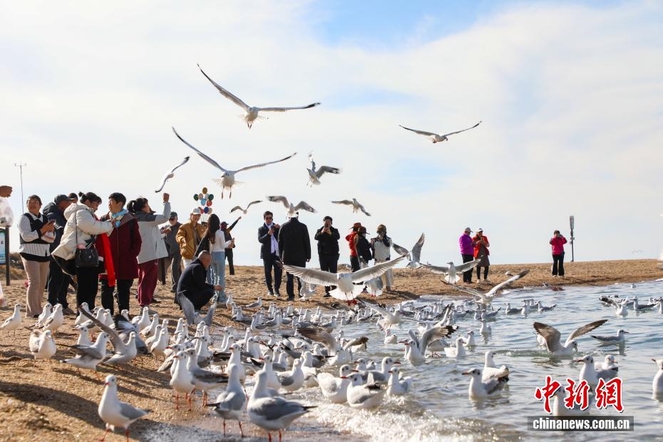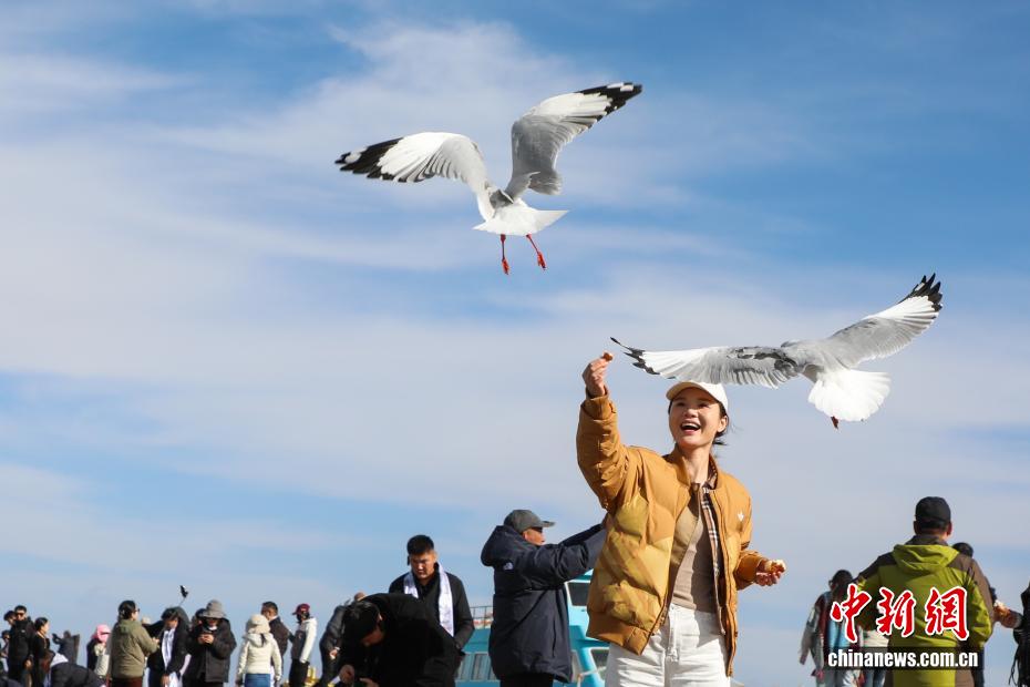 10月22日,青海省海南藏族自治州共和縣青海湖畔,游客與水鳥互動(dòng)。中新社記者 馬銘言 攝