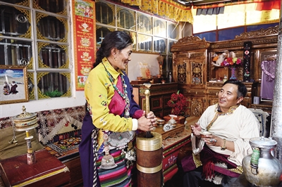 居住在阿里噶爾縣康樂(lè)新居的斯瓊正在品嘗妻子普珍制作的酥油茶。2017年,斯瓊一家從海拔4570米的改則縣麻米鄉(xiāng)搬入了噶爾縣生態(tài)安置小區(qū)康樂(lè)新居。據(jù)了解,根據(jù)西藏自治區(qū)黨委、政府的決策部署,當(dāng)?shù)卣畬?duì)海拔4700米以上極高海拔地區(qū)實(shí)施生態(tài)搬遷,實(shí)現(xiàn)群眾脫貧致富和生態(tài)環(huán)境改善。