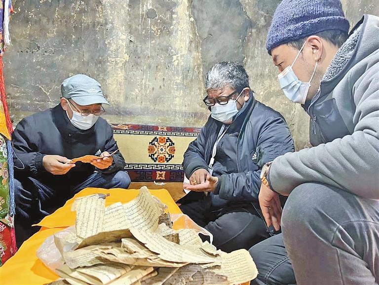 扎西頓珠陪同自治區(qū)圖書館古籍保護中心專家在林周縣普查藏文古籍。