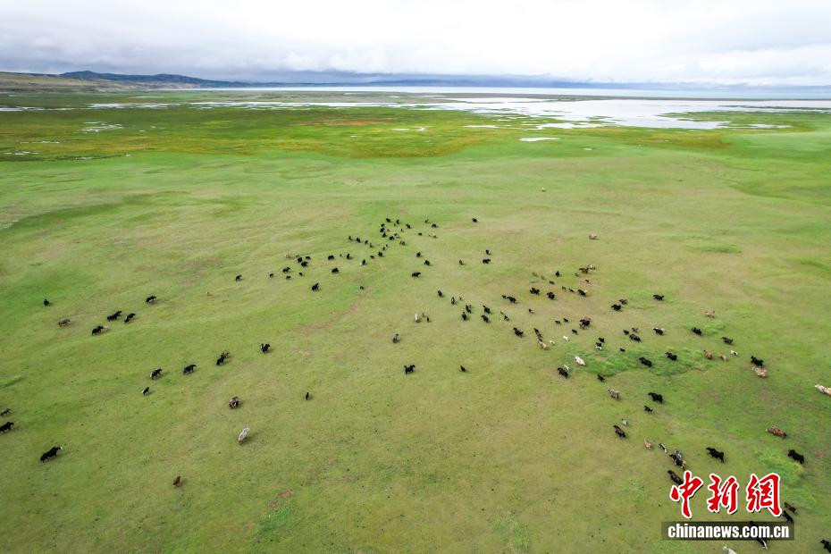 7月22日,在西藏阿里地區(qū)普蘭縣霍爾鄉(xiāng),牧民在瑪旁雍錯(cuò)濕地上放牧牦牛。為實(shí)現(xiàn)更大的經(jīng)濟(jì)效益,霍爾鄉(xiāng)近年來(lái)探索建立牦牛養(yǎng)殖專業(yè)合作社,按當(dāng)?shù)刈匀粭l件合理分配牦牛放牧地點(diǎn),并將牛奶進(jìn)行加工銷售,2023年該合作社的年總收入達(dá)到60余萬(wàn)元人民幣,帶動(dòng)牧民人均增收2萬(wàn)余元人民幣。(無(wú)人機(jī)照片)中新社記者 張祥毅 攝