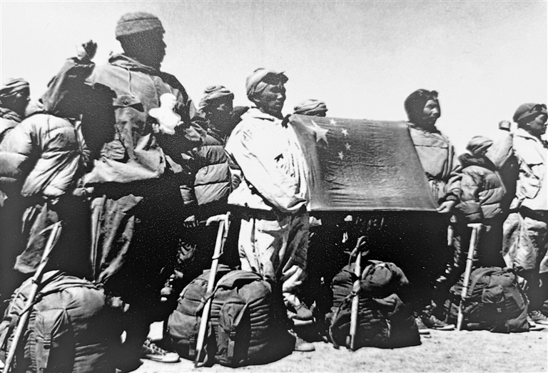 1975年5月28日,《西藏日報》頭版頭條刊發(fā)新華社消息《我國登山隊從北坡勝利登上珠穆朗瑪峰》和評論《敢于攀登高峰》。消息寫道:“九名男女登山運(yùn)動員在珠峰峰頂展開了鮮艷的五星紅旗,豎立了一個寫有‘中華人民共和國登山隊’字樣的三米高的紅色金屬測量覘標(biāo),拍攝了頂峰的照片和影片,并測量了頂峰覆雪深度,采集了冰雪樣品和巖石標(biāo)本,還做了無線電遙測心電圖,為我國精確測定珠穆朗瑪峰的高程和有關(guān)科學(xué)研究創(chuàng)造了非常重要的條件,提供了十分珍貴的資料?!?/p>