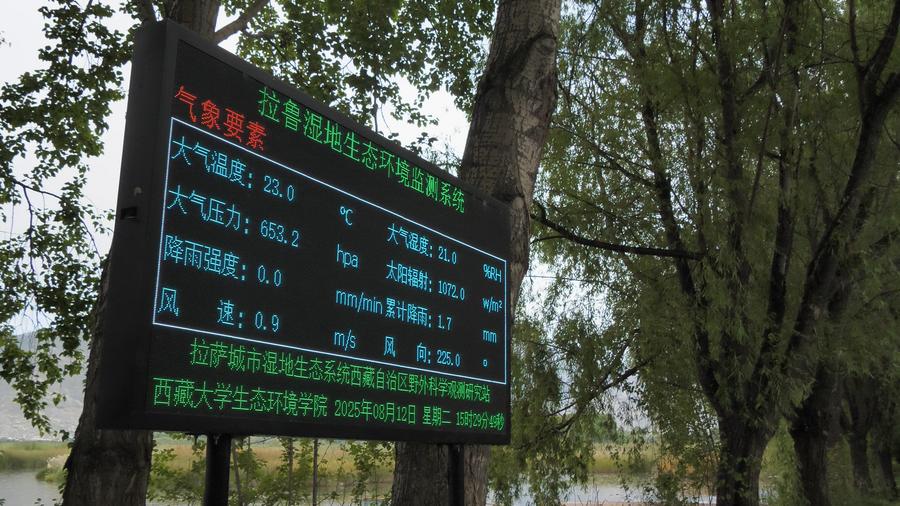 拉魯濕地國(guó)家級(jí)自然保護(hù)區(qū)南門(mén)內(nèi)的生態(tài)環(huán)境監(jiān)測(cè)系統(tǒng)顯示屏,實(shí)時(shí)顯示濕地內(nèi)的氣象要素、土壤和水環(huán)境、植被指數(shù)等數(shù)據(jù)。新華社記者 黃智琪 攝