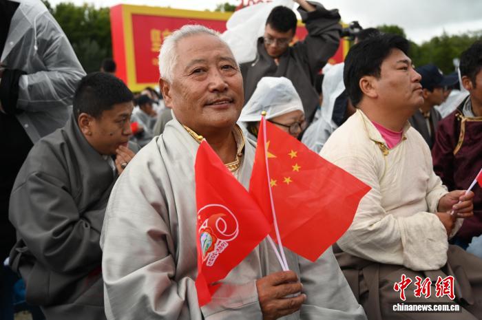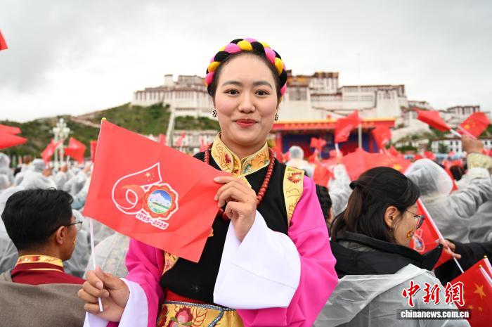 8月21日,拉薩古城居民羅桑群佩在布達(dá)拉宮廣場(chǎng)參加慶?;顒?dòng)。中新社記者 趙朗 攝