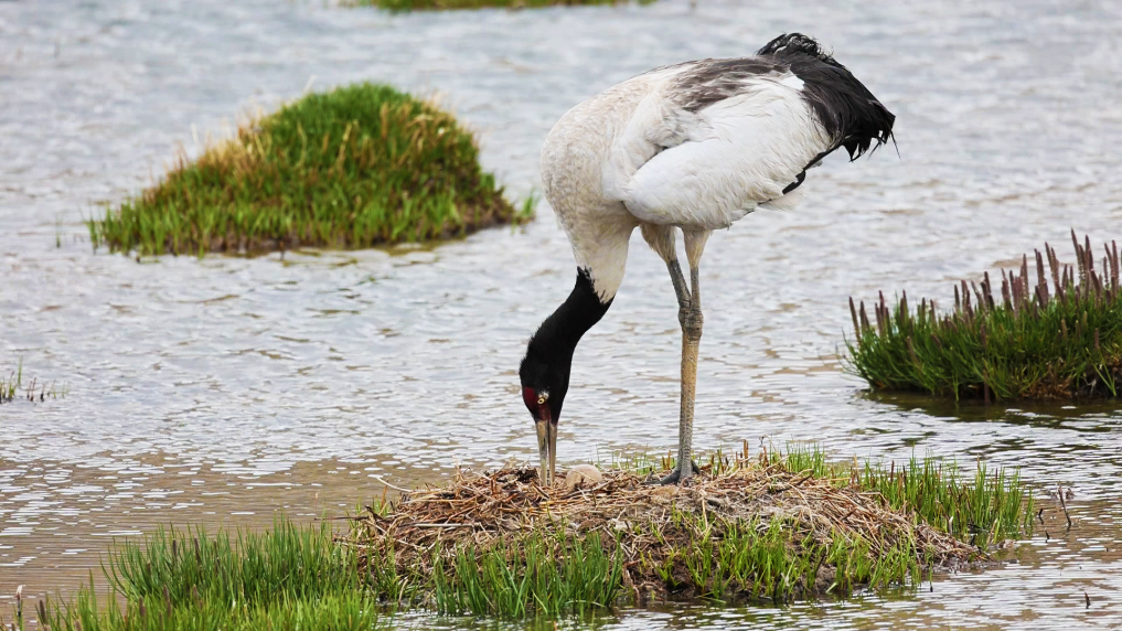 黑頸鶴正在調(diào)整蛋的位置和姿態(tài)。