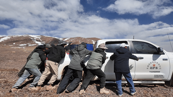 眼前這一幕仿佛預(yù)示著藏羚羊的遷徙之路和我們的巡護(hù)之路同樣艱難。再往前行駛不遠(yuǎn),車隊中的皮卡車肉眼可見在泥里越陷越深。