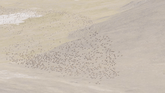 在這段來時無比顛簸的路上,我們?nèi)缏钠降亍r間好像凍結(jié)了,直到我們登上那個山坡,數(shù)不盡的藏羚羊挑破了凝固的空氣,成千上萬的脊背在山坡上流動,山脊上藏羚羊的剪影印刻在天際線上。