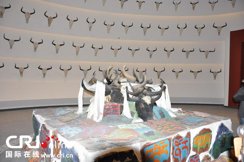 西藏牦牛博物館一共分四個廳:感恩牦牛、探秘牦牛、相伴牦牛、靈美牦牛。十世班禪大師生前說過:“沒有牦牛就沒有藏族”,深刻地揭示了牦牛與藏族密不可分的關系。感恩牦牛展廳運用轉(zhuǎn)經(jīng)筒、牦牛頭骨、瑪尼堆、場景畫、壁畫等形式,表達了藏族人民對牦牛的感恩和崇敬。圖為感恩牦牛展廳中的展品--自然死亡的野牦牛頭部。圖片來源:國際在線