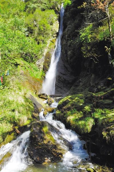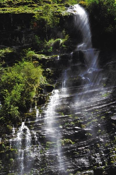 終于到了崗?fù)て俨?,飛濺的水花在陽光下晶瑩剔透,與四周蔥郁的森林動(dòng)靜相宜。當(dāng)我們爬到山頂,也就是在第三層瀑布上時(shí),勒布溝又給了我們一個(gè)大大的驚喜——一道彩虹懸掛在瀑布旁邊,如夢(mèng)如幻,美不勝收。