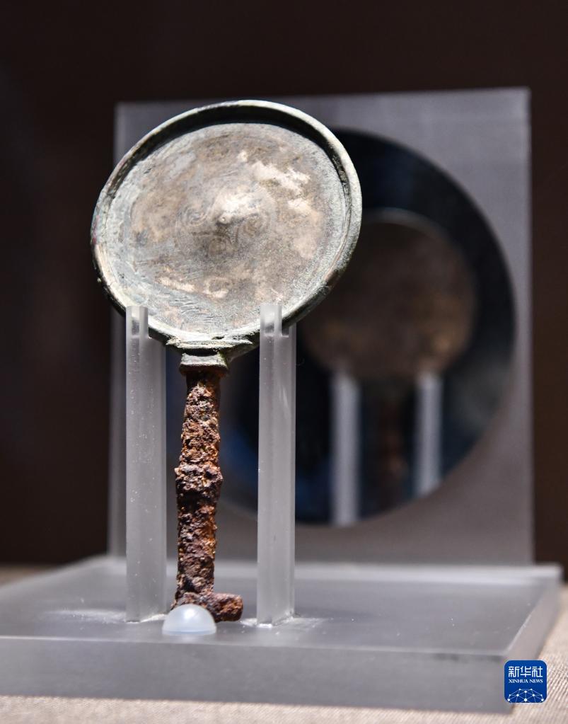 這是6月29日拍攝的西藏博物館新館展品——早期金屬時(shí)代的鐵柄銅鏡。該銅鏡出土于拉薩曲貢遺址,鏡體為銅質(zhì),柄為鐵質(zhì),鏡背飾雙鳥、卷草紋,似有牦牛圖象。新華社記者 晉美多吉 攝