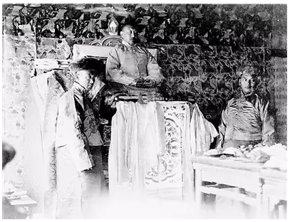 圖為1935年,九世班禪額爾德尼·曲吉尼瑪(中)在內(nèi)蒙古各地為僧眾祈禱祝福 圖片來源:中國之聲公眾號(hào)