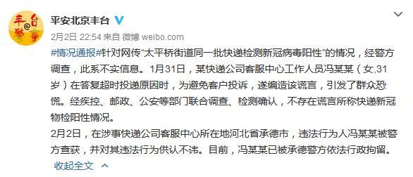 據(jù)北京豐臺(tái)公安分局官方微博消息,針對(duì)網(wǎng)上流傳“太平橋街道同一批快遞檢測新冠病毒陽性”的情況,經(jīng)警方調(diào)查,此系不實(shí)信息。1月31日,某快遞公司客服中心工作人員馮某某(女,31歲)在答復(fù)超時(shí)投遞原因時(shí),為避免客戶投訴,遂編造該謊言,引發(fā)了群眾恐慌。經(jīng)疾控、郵政、公安等部門聯(lián)合調(diào)查、檢測確認(rèn),不存在謊言所稱快遞新冠物檢陽性情況。