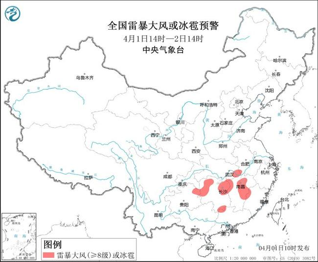預(yù)計(jì)4月1日14時(shí)至2日14時(shí),湖北東部、湖南中北部、江西中北部、貴州東北部等地的部分地區(qū)將有8—10級(jí)雷暴大風(fēng)或冰雹天氣,局地風(fēng)力可達(dá)11級(jí)以上;安徽中南部、江蘇中南部、湖北中東部、湖南中北部、江西、浙江西部、福建西部和沿海地區(qū)、重慶中部、貴州東部、云南西北部、廣東北部等地的部分地區(qū)將有短時(shí)強(qiáng)降水天氣,最大小時(shí)雨量30—50毫米,局地可達(dá)70毫米以上。