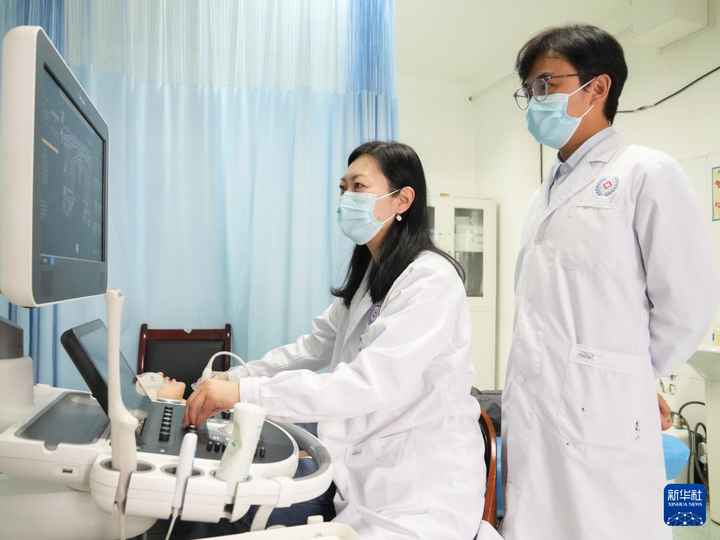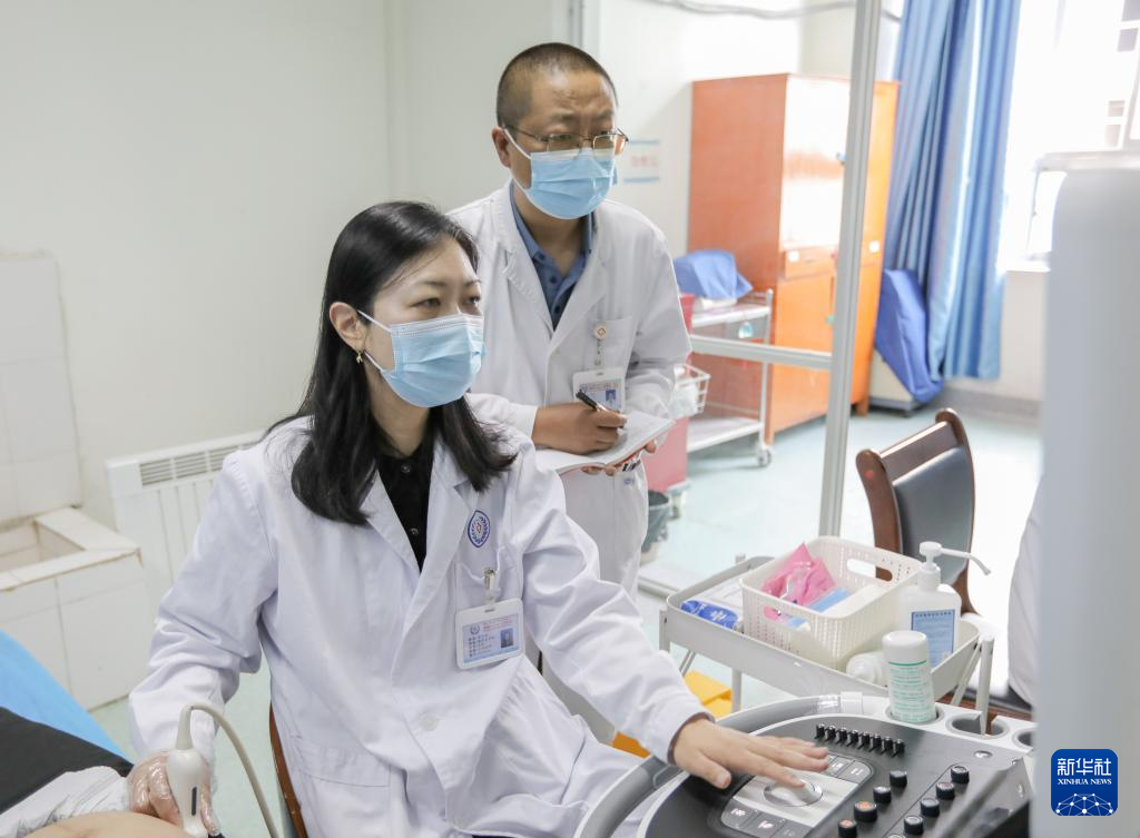 在西藏自治區(qū)人民醫(yī)院,徐鐘慧(左)與徒弟宋彬彬在為患者進(jìn)行超聲檢查(7月12日攝)。新華社發(fā)