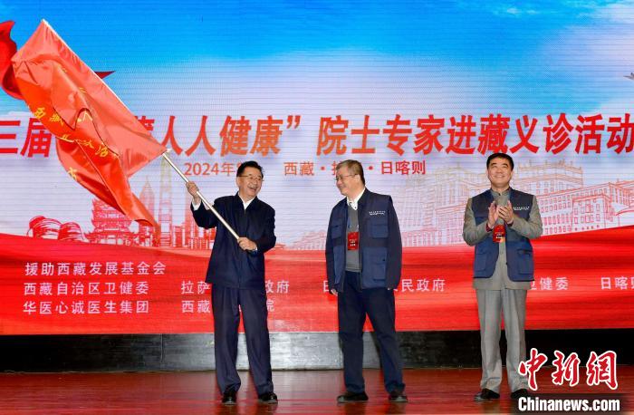圖為第三屆“西藏人人健康”院士專家進(jìn)藏義診活動(dòng)啟動(dòng)儀式上,西藏自治區(qū)副主席甲熱·洛桑丹增(圖左)為義診專家團(tuán)隊(duì)代表授旗。李林 攝