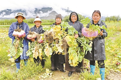 中國(guó)科學(xué)院創(chuàng)新研發(fā)的蕪菁種植技術(shù)為促進(jìn)當(dāng)?shù)剞r(nóng)業(yè)生產(chǎn)與畜牧業(yè)的發(fā)展提供了技術(shù)支撐。圖為拉薩市曲水縣才納鄉(xiāng)村民抱著蕪菁新品種。