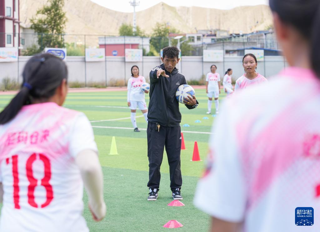 西藏日喀則市上海實驗學校“珠峰雪鷹”女子足球隊教練王劍平(前)在操場上指導球員訓練(9月3日攝)。