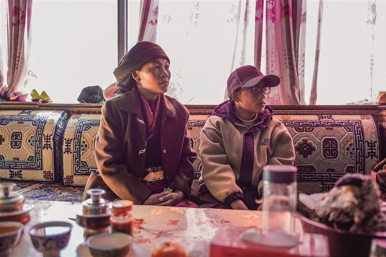 當(dāng)日,天空晴朗,在廣袤無(wú)垠、無(wú)樹(shù)木遮擋的曠野上,稍起一陣疾風(fēng),便會(huì)揚(yáng)起一層薄薄的黃沙。從村委會(huì)出發(fā),沿著冰湖畔的水泥小路前行,很快就來(lái)到了村民倫珠曲珍的家。一進(jìn)屋,厚實(shí)的木門便將凜冽的寒風(fēng)擋在了門外?!翱煺?qǐng)進(jìn),這幾天風(fēng)沙有點(diǎn)大,普莫雍措都沒(méi)以前藍(lán)了?!眰愔榍湟贿呹P(guān)門一邊熱情地笑著說(shuō)道。