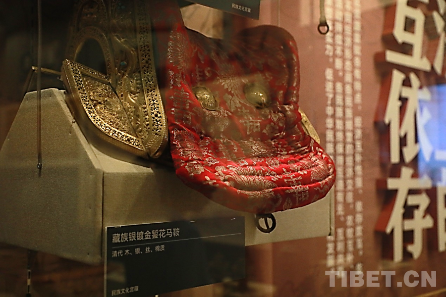 圖為“鑄牢中華民族共同體意識文物古籍展”茶馬互市文物展區(qū)內(nèi)的馬鞍 攝影:張藝彤
