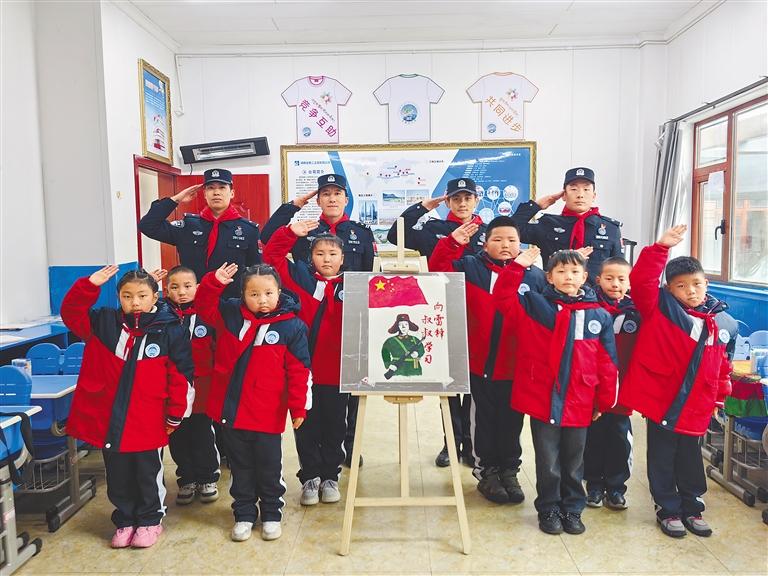 圖為玉麥邊境派出所民警、玉麥鄉(xiāng)小學(xué)學(xué)生與雷鋒畫(huà)像合影。 通訊員 扎西根培 記者 張宇 攝