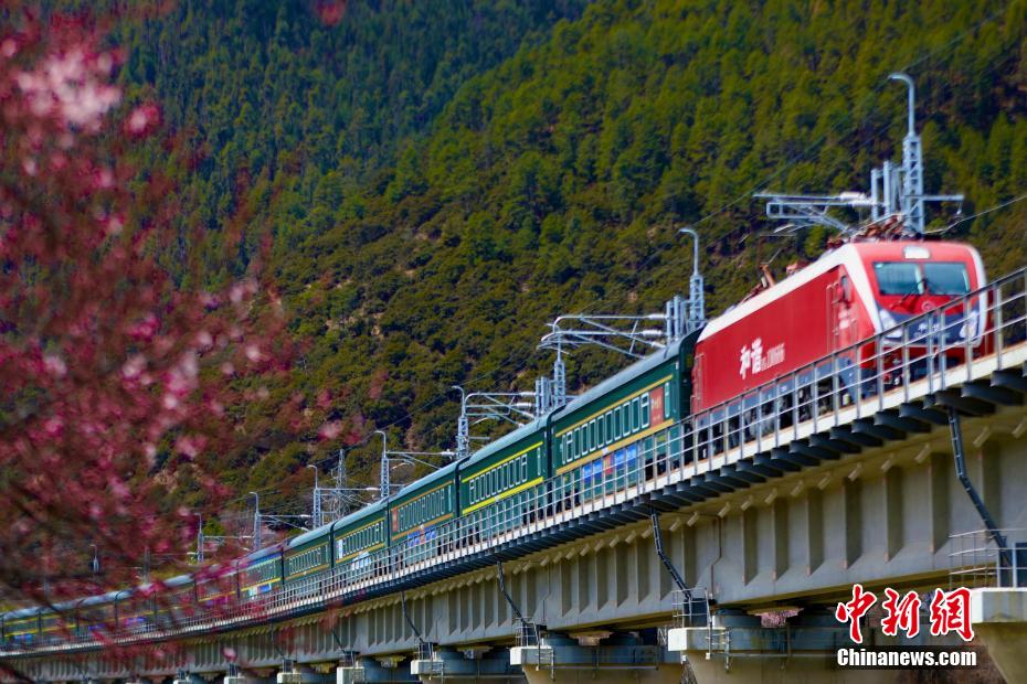圖為拉林鐵路沿線桃花盛開(kāi),列車飛馳而過(guò)。