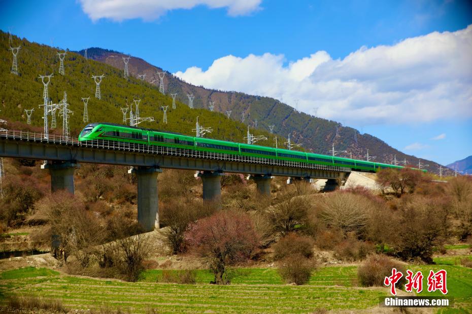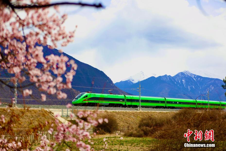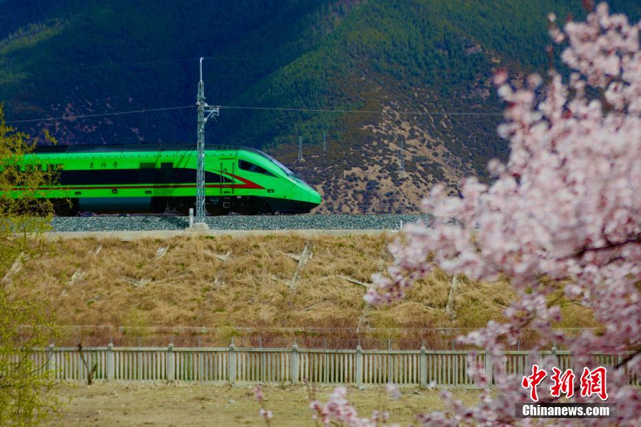 被譽(yù)為新“天路”的拉林鐵路,是中國(guó)首條高原電氣化鐵路,于2021年6月25日開(kāi)通運(yùn)營(yíng),結(jié)束了西藏東南地區(qū)不通鐵路的歷史。圖為拉林鐵路沿線桃花盛開(kāi),與飛馳而過(guò)的動(dòng)車構(gòu)成別樣風(fēng)景圖。