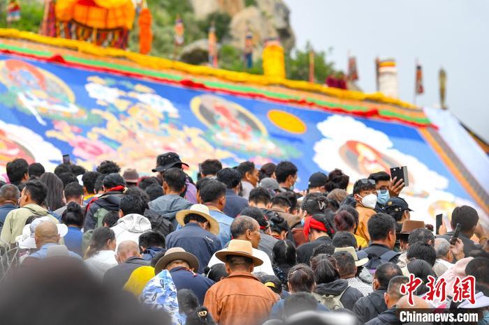 記者跟隨信眾和游客沿著山道緩緩前行,共同目睹那震撼人心的展佛儀式。當(dāng)巨大的釋迦牟尼佛像唐卡徐徐展開(kāi),信眾們向巨幅釋迦牟尼唐卡拋出寓意吉祥的哈達(dá),雙手合十,眼中滿是敬畏與虔誠(chéng),口中念念有詞,誠(chéng)摯地祈禱著風(fēng)調(diào)雨順、幸福安康。