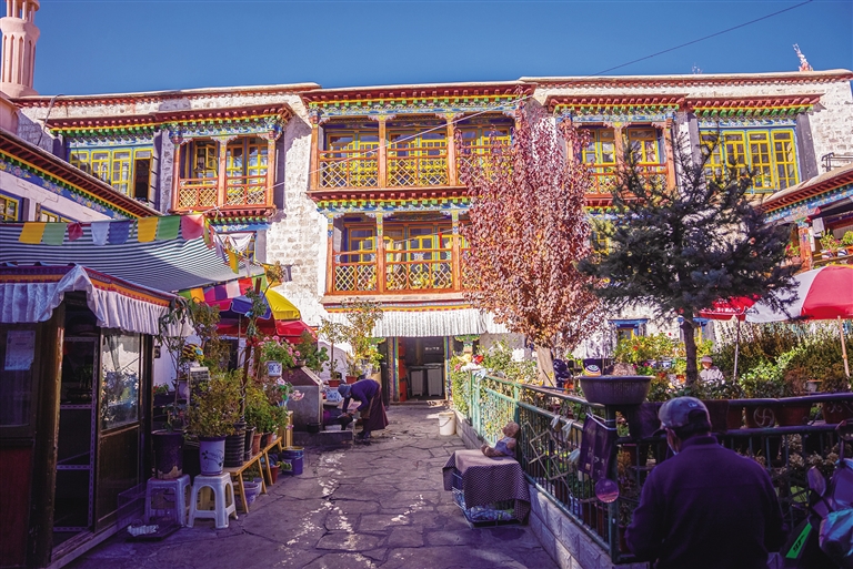 走進八廓街、穿過繁華的大昭寺廣場,沿著古巷小路便能來到貢桑孜大院。邁入大院,首先映入眼簾的是獨具韻味的傳統(tǒng)藏式建筑風格,白墻、紅頂、黑窗沿,陽光滲過在微風中飄動的“香布”,稀稀散散地落在精美的木雕窗花上,襯得陽臺木制立柱上的花紋分外醒目。各式花卉與居民生活用品一同擺放在四四方方的院落中,卻并不顯得擁擠,反而增添了一絲浪漫的煙火氣。