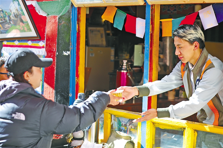 旦增格桑為顧客服務(wù)。
