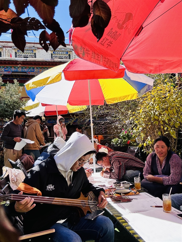 市民在貢桑孜大院彈奏扎木念。