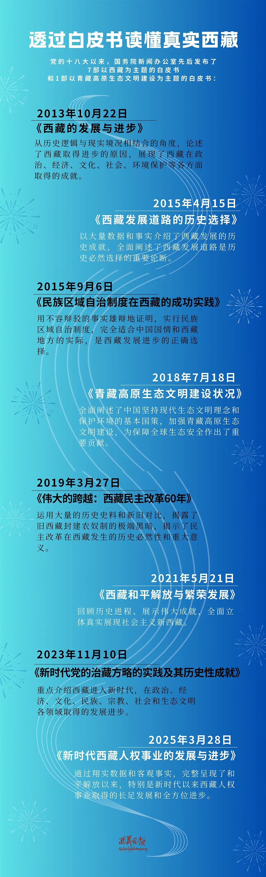 3月28日,國務(wù)院新聞辦公室發(fā)布《新時代西藏人權(quán)事業(yè)的發(fā)展與進步》白皮書。這也是黨的十八大以來,國務(wù)院新聞辦公室發(fā)布的以西藏為主題的第七部白皮書。這些白皮書涉及西藏經(jīng)濟社會發(fā)展的各方面,真實地展現(xiàn)了西藏步入發(fā)展最好、變化最大、群眾得實惠最多的新時代,各項事業(yè)取得的全方位進步、歷史性成就。