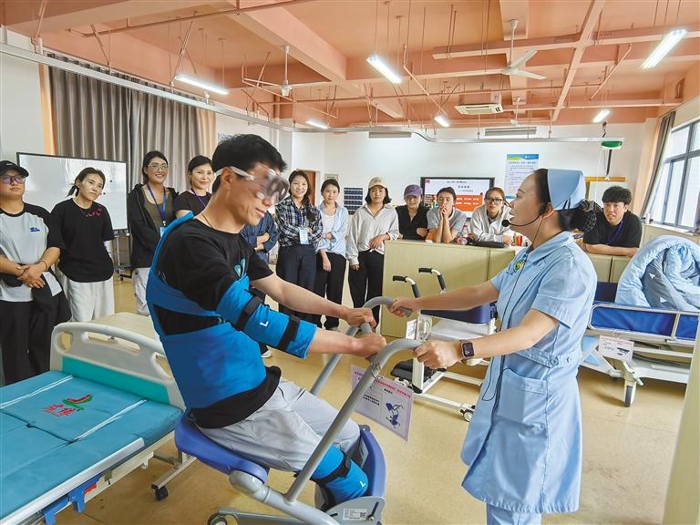 “看到老師為我們展示幫助失能老人翻身時(shí)使用的借力技巧時(shí),才發(fā)現(xiàn)這些細(xì)節(jié)我們以前都沒(méi)關(guān)注過(guò)?!睂W(xué)員們?cè)谟浭卤旧厦苊苈槁橛浿o(hù)理技術(shù)要點(diǎn)。