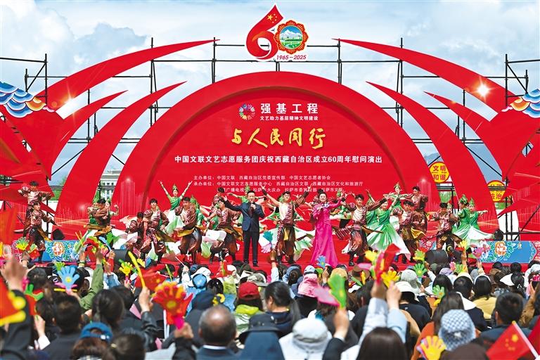 上午10時(shí)整,“與人民同行”中國文聯(lián)文藝志愿服務(wù)團(tuán)慶祝西藏自治區(qū)成立60周年慰問演出,在歌舞《鼓舞西藏》的熱烈氛圍中正式開場(chǎng)。