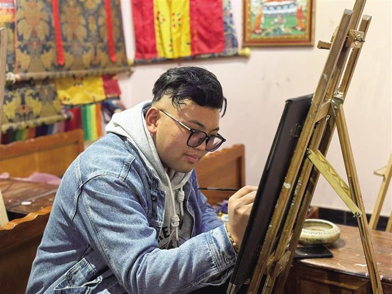 只見占地不到20平方米的小屋內(nèi),擺放著各類唐卡畫作。既有傳統(tǒng)唐卡作品,亦有動(dòng)畫人物的“繪像”。描邊的金屬絲和光滑的質(zhì)感表面讓人忍不住駐足欣賞。店里陳列著巴掌大小的掐絲唐卡,金線掐絲在礦物顏料映襯下流光溢彩。畫師兼老板的南吉合多杰正在完成一份岡仁波齊的客單:“勉薩畫派的特色是線條細(xì)膩,顏色過(guò)渡自然。選好圖案后,會(huì)根據(jù)載體材質(zhì)、大小(例如石頭大小、木板長(zhǎng)短等)收費(fèi)?!彼贿呎f(shuō)著,一邊用特制工具將顏料注入金絲隔斷。