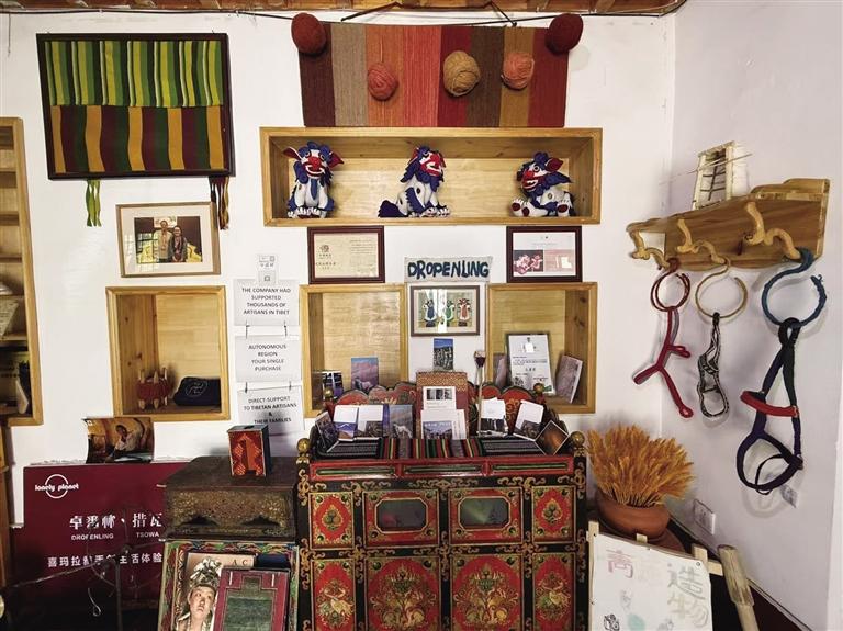 進(jìn)入卓番林,只見狹長(zhǎng)的店面內(nèi)琳瑯滿目地?cái)[著各類富有藏元素的物件,里側(cè)的木質(zhì)貨架上整齊掛著多條不同顏色和格紋樣式的織物,貨架上方擺放著展示手工編織過(guò)程的照片。工作人員告訴記者,這些都是可售賣的,除此之外,游客來(lái)到這里,還可以體驗(yàn)酥油香皂、酥油唇膏、藏式刺繡等手工DIY。