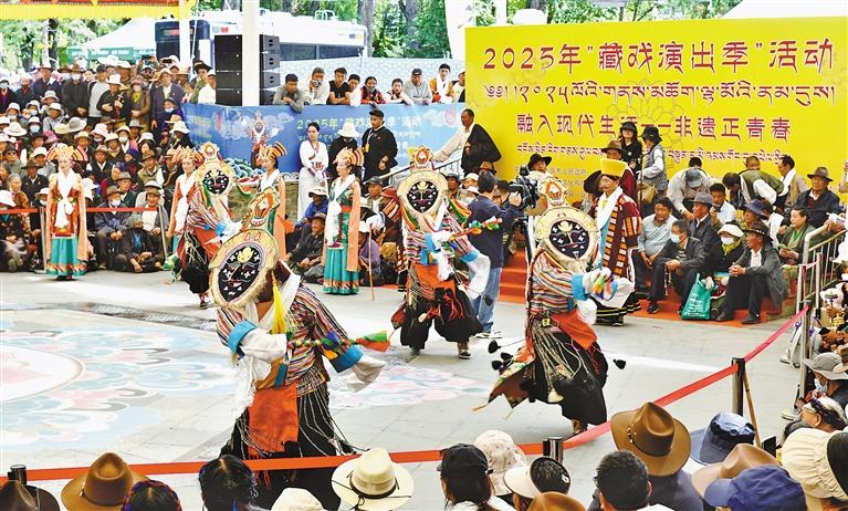 6月13日,以“融入現(xiàn)代生活——非遺正青春”為主題的2025年“藏戲演出季”活動在拉薩市宗角祿康公園舉行。本次活動由非遺體驗、產品展銷、藏戲展演三個部分組成,精彩的表演吸引了眾多市民游客觀看。 圖為活動現(xiàn)場,拉薩市堆龍德慶區(qū)措麥藏戲隊帶來的藏戲劇目《智美更登》。記者 旦增蘭澤 攝