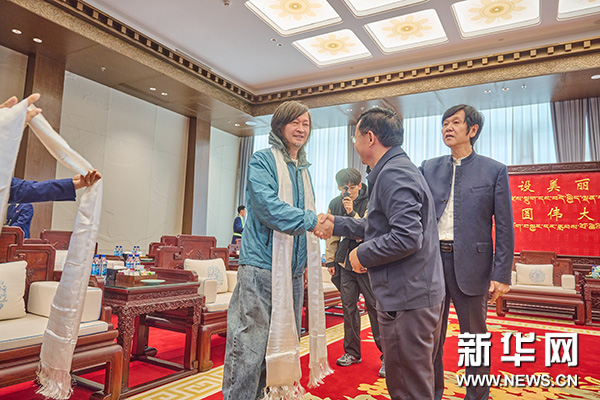 西藏自治區(qū)黨委宣傳部副部長(zhǎng)、文化和旅游廳黨組書記肖傳江向藝術(shù)家們敬獻(xiàn)哈達(dá)