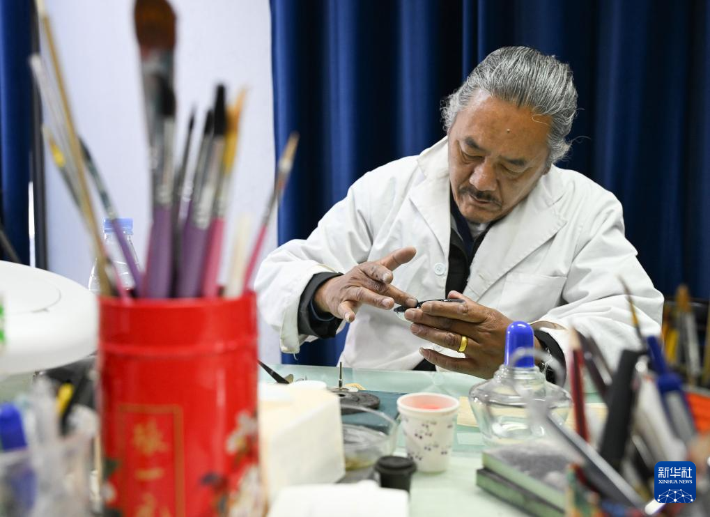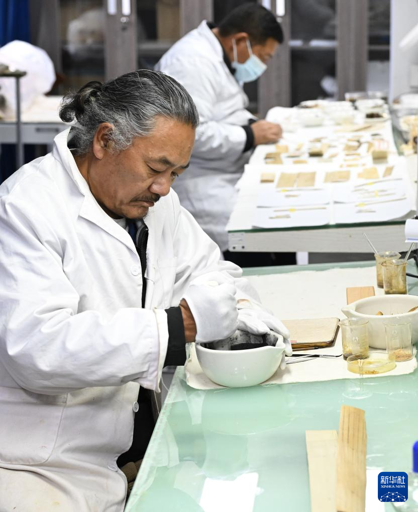 布達拉宮貝葉經實驗性修復小組實驗室工作人員對用于貝葉修復的顏料進行研磨處理(5月25日攝)。新華社記者 旦增尼瑪曲珠 攝