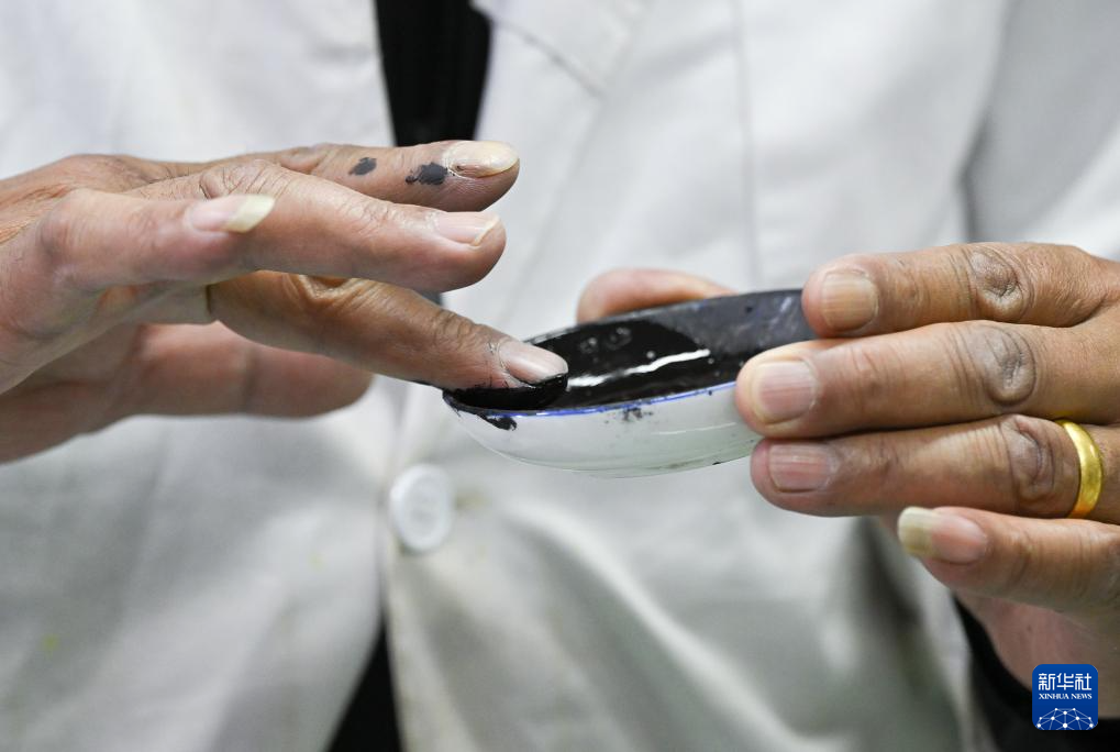 布達拉宮貝葉經實驗性修復小組實驗室工作人員對用于貝葉修復的顏料進行研磨處理(5月25日攝)。新華社記者 李賀 攝