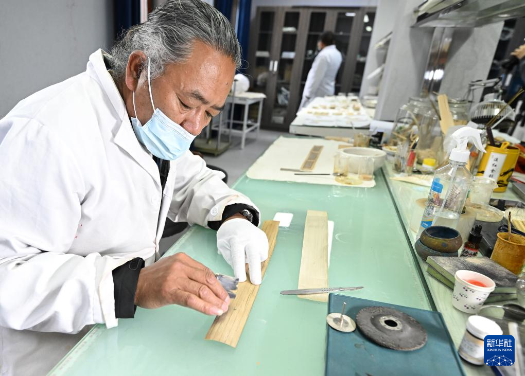 布達拉宮貝葉經實驗性修復小組實驗室工作人員對貝葉進行處理(5月25日攝)。新華社記者 李賀 攝