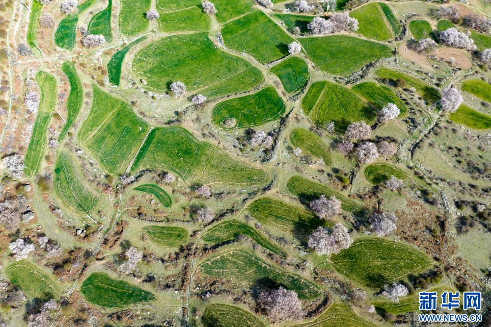4月18日,在嘉黎縣尼屋鄉(xiāng)境內(nèi)田間盛開的桃花(無人機照片)。新華網(wǎng) 旦增努布 攝