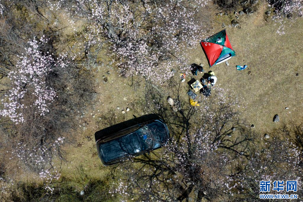 4月18日,群眾在嘉黎縣尼屋鄉(xiāng)境內(nèi)桃花間“過林卡”(無人機照片)。新華網(wǎng) 旦增努布 攝