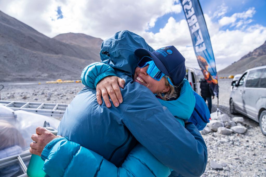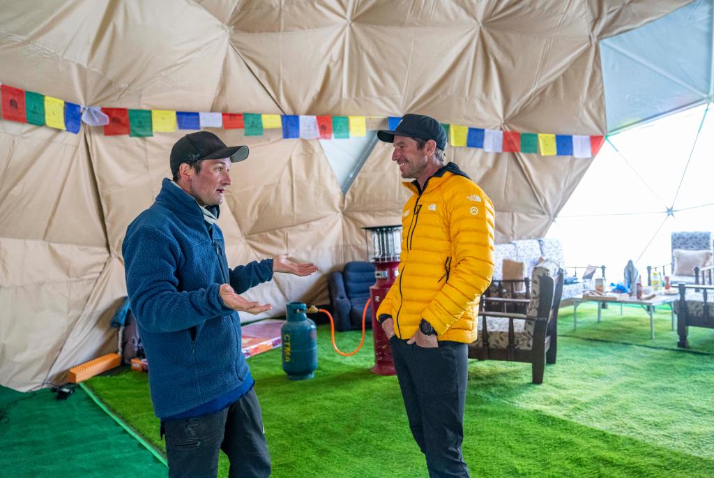 在珠峰登山大本營,盧卡斯·富滕巴赫(右)正在和隊(duì)友哈康·埃蘭森聊天交流(5月24日攝)。新華社記者 孫非 攝