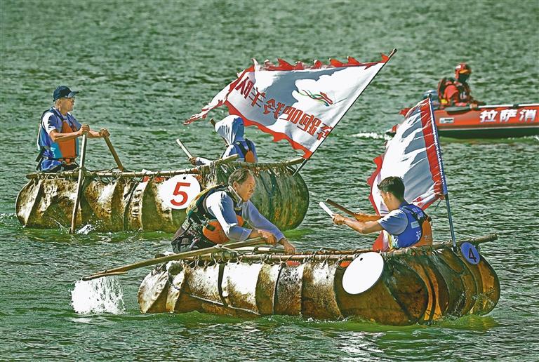 參賽隊伍在牛皮船比賽中。記者 白瑪澤旺 攝