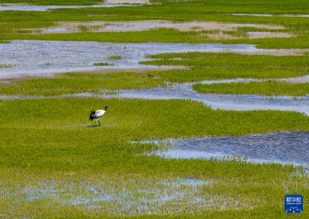 黑頸鶴在濕地和藏羚羊一起覓食(6月8日攝)。新華社記者 晉美多吉 攝