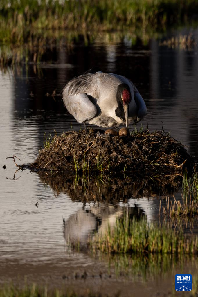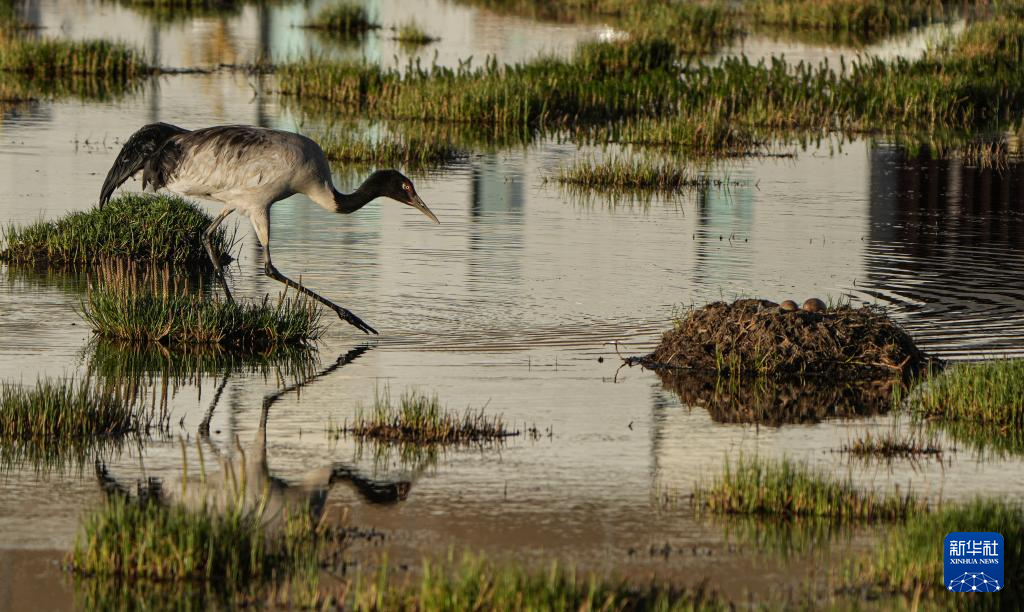 黑頸鶴在濕地孵蛋(6月7日攝)。新華社記者 姜帆 攝