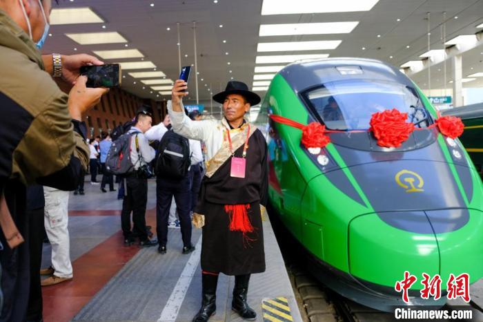 資料圖為2021年6月25日,西藏拉林鐵路開通運(yùn)營,拉薩曲水縣三有村村民次旦平措在復(fù)興號(hào)前拍照留念。記者 江飛波 攝